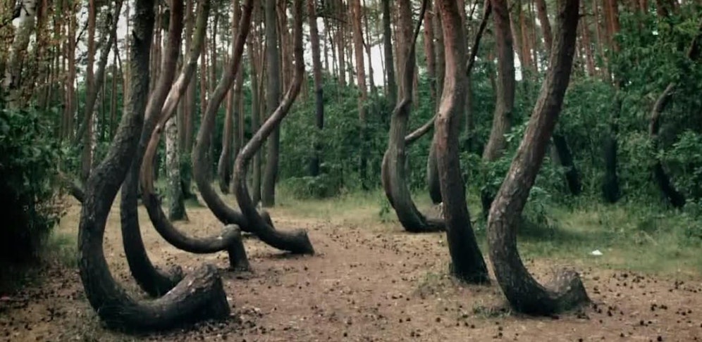 Der sogenannte krumme Wald nahe der Westgrenze Polens gilt bei Naturfotografen als beliebtes Motiv. Grund sind die seltsamen Baumstämme, die wenige Zentimeter über dem Boden fast horizontal wachsen, einen Bogen formen und dann bis zu 12 Meter in die Höhe ragen.