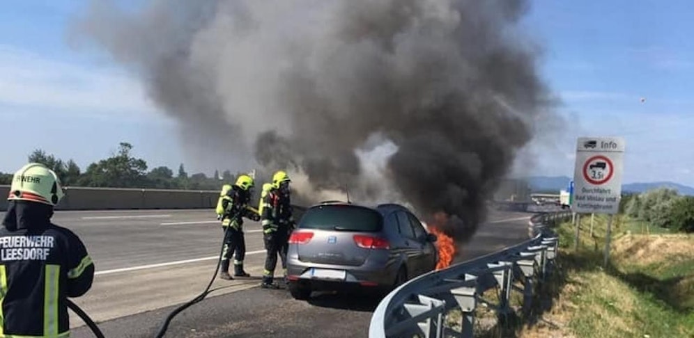 Dichte Rauchsäule am Mittwochvormittag über der Südautobahn bei Baden: Ein Seat war in einer Pannenbucht im Motorbereich in Flammen aufgegangen, der Lenker hatte das Fahrzeug noch rechtzeitig abgestellt und das Auto verlassen.