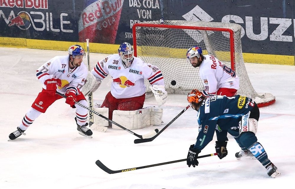 Red Bull Salzburg ist am Freitag mit einem klaren Heimsieg gegen die Black Wings Linz in das Endspiel der Erste Bank Eishockey Liga eingezogen. Die Salzburger entschieden die Halbfinalserie (best of five) durch ein 3:0 ohne Niederlage für sich. Ihr Finalgegner steht noch nicht fest, weil der VSV mit einem 5:1 in Bozen auf 1:2 verkürzte. Diese Serie wird am Sonntag in Villach fortgesetzt.