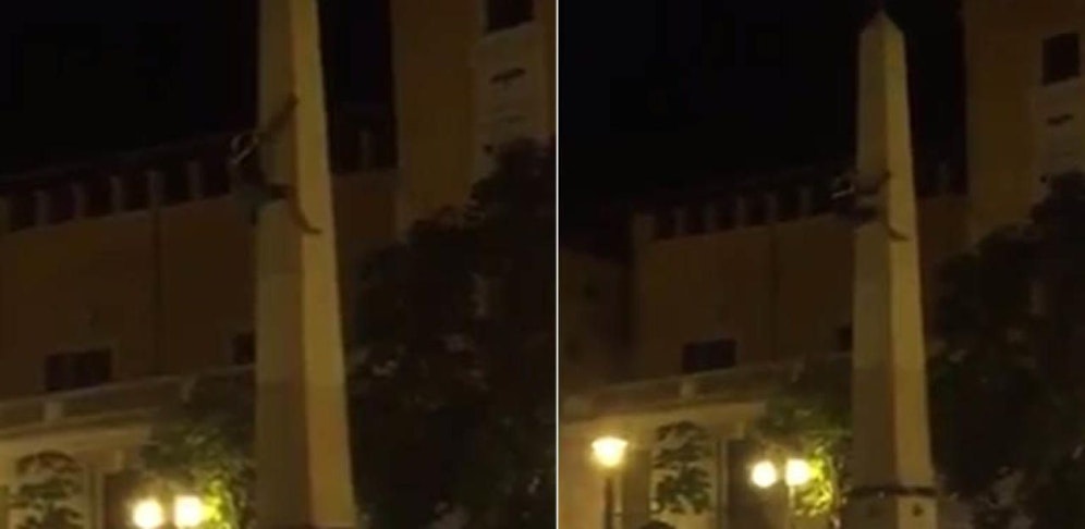 Der Fan kletterte während der Feiern der Madrider Fußballfans auf Mallorca aus lauter Freude auf die hohe Säule eines Springbrunnens und begeisterte damit sichtlich die Massen.