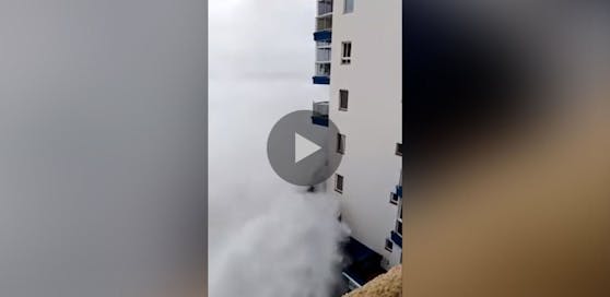 Augenzeugen filmten die Wucht der Wellen, die aufs Land trafen – und sogar Balkone eines mehrstöckigen Appartementblocks zerstörten.