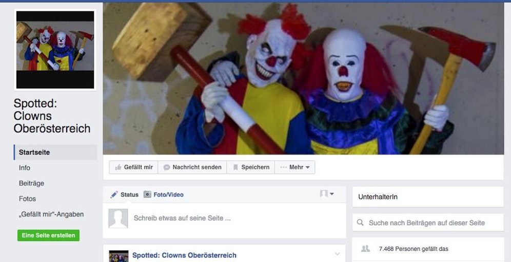 Doch: Es wurden ausschließlich Fake-Meldungen gepostet. In der Facebook-Timeline der Seite gibt es quasi Clown-Sichtungen im Stundentakt. In ganz OÖ. Was natürlich Blödsinn ist.