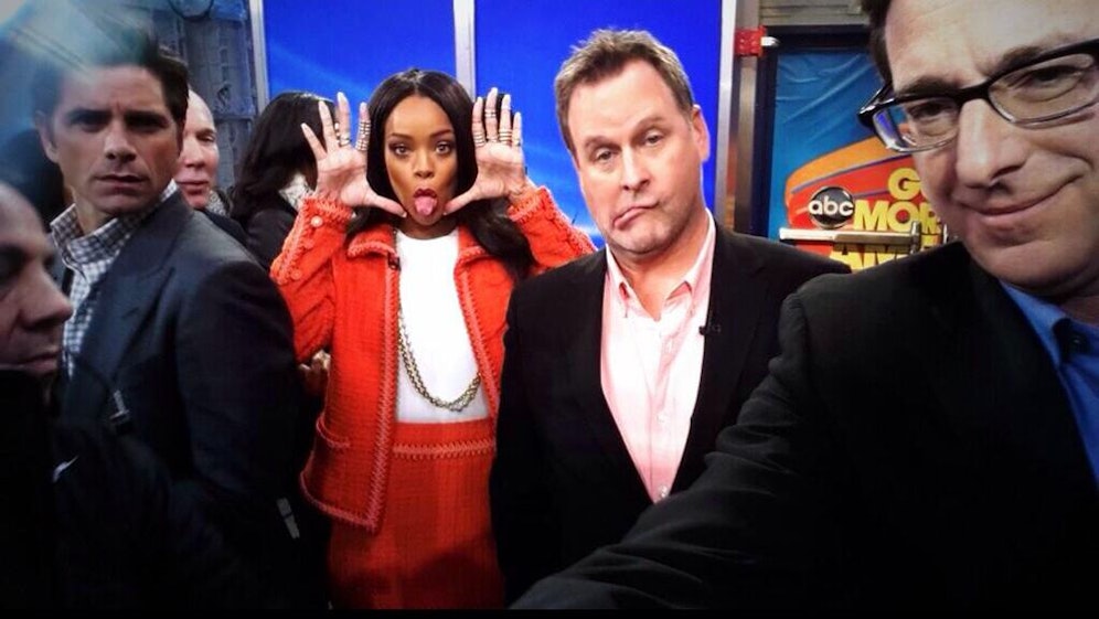 Saget hatte die Rechnung allerdings ohne einen frechen Popstar gemacht. Ohne das Wissen der drei in die Jahre gekommenden Fernsehschauspieler schlich sich nämlich Rihanna von hinten an das Trio heran, um mit ihnen gemeinsam auf den Fotos zu posieren.
