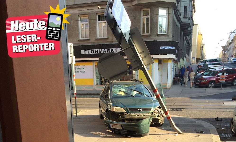 Augenzeugen zufolge scheiterte einer der beiden Fahrer an einem riskanten Überholmanöver, wodurch es zum Unfall auf der Ottakringer Straße gekommen ist. Die Wucht des Aufpralls war so groß, dass der grüne Pkw aus Serbien ein Verkehrszeichen abschoss, bevor er zum Stillstand kam.
