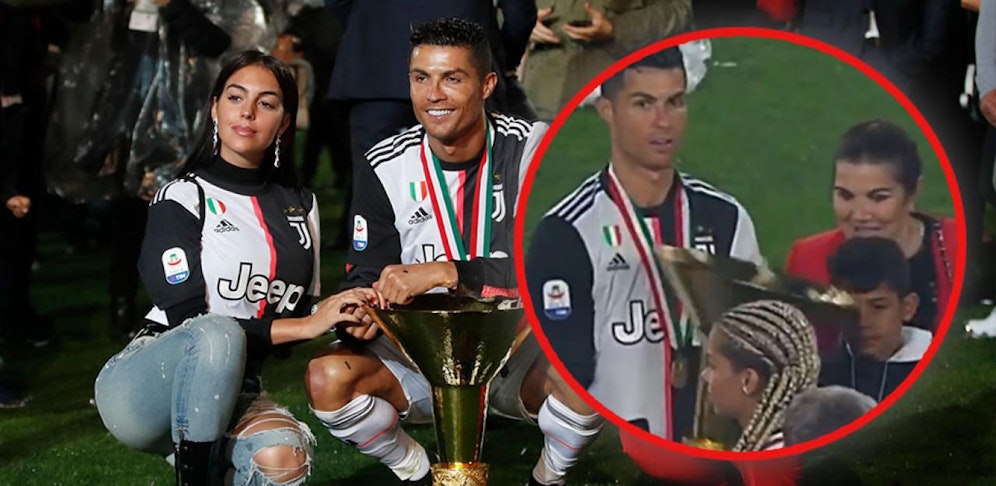 Auch Herzblatt Georgina Rodriguez kam die Trophäe zu spüren. Während sich Ronaldo und seine Mutter um den, offenbar unverletzten, Sohn kümmerten, schwenkte der 34-Jährige den Kelch auf die andere Seite und traf Rodriguez an der Brust.