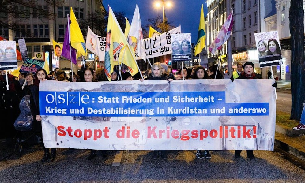 Die Demonstranten forderten in Slogans ein "Ende der Kriegstreiberei" in den Kurdengebieten in Syrien, dem Irak und der Türkei. Der Protestzug verlief laut der Hamburger Polizei, die mit mehreren Hundertschaften vor Ort war, friedlich. Lediglich zweimal kam es zu Böller-Würfen.