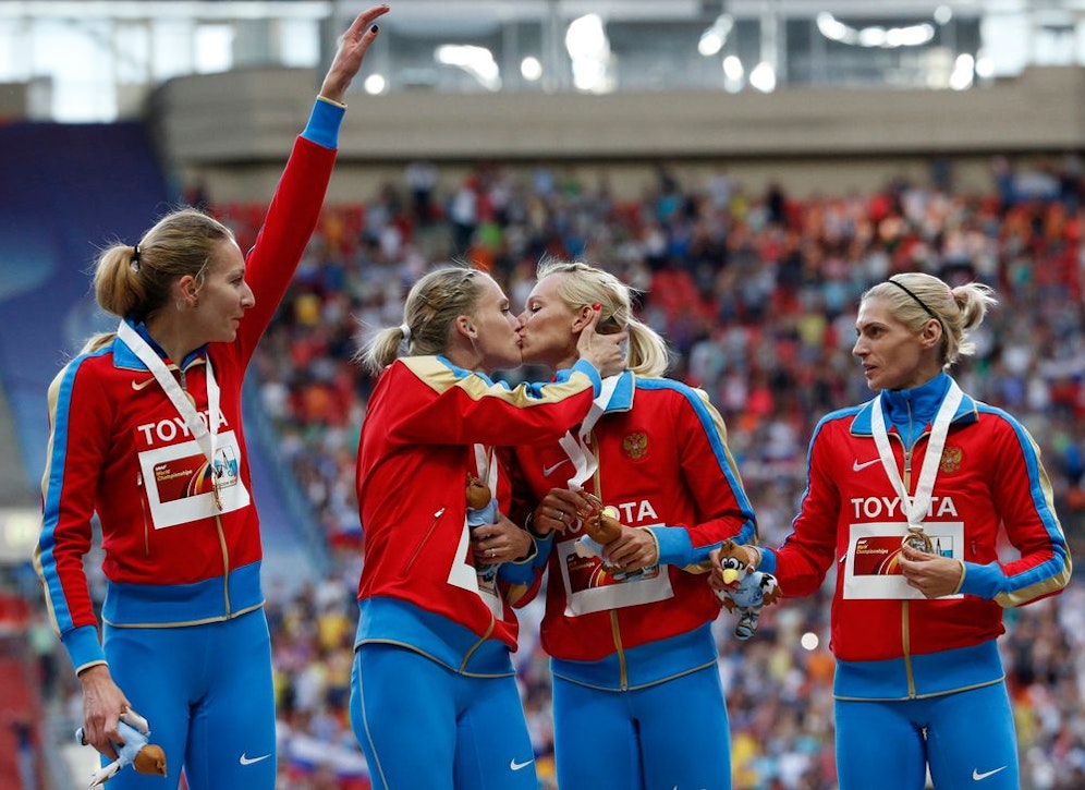 Bei der Siegerehrung am Sonntag waren im Luschniki-Stadion alle Augen auf die russische 4x400-Meter-Staffel gerichtet. Das wussten Tatjana Firowa und Xenija Ryschowa für ein wichtiges Anliegen zu nutzen. Die beiden Läuferinnen küssten sich provokativ auf den Mund und machten auf diese Weise ihrem Ärger über das Anti-Homosexuellen-Gesetz, das die Aufklärung Minderjähriger über Homosexualität unter Strafe stellt, Luft. Als sie mit ihren Kolleginnen auf dem Podium standen, küssten sich sogar alle vier Athletinnen (siehe Video).