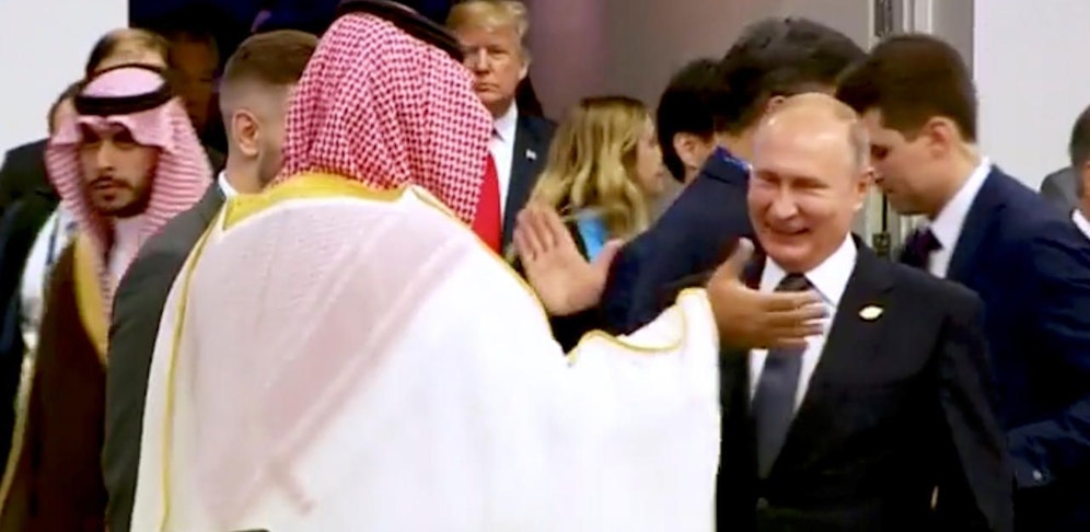 Über TV-Sender und im Netz verbreiten sich die Szenen in Windeseile. Auf dem G20-Gipfel in Buenos Aires haben Russlands Präsident Wladimir Putin und Saudi Arabiens Kronprinz Mohammed bin Salman sich begrüßt – und das skurril euphorisch, lachend und mit abklatschenden Händen. Auch die erste Arbeitssitzung verbrachten sie lachend nebeneinander.