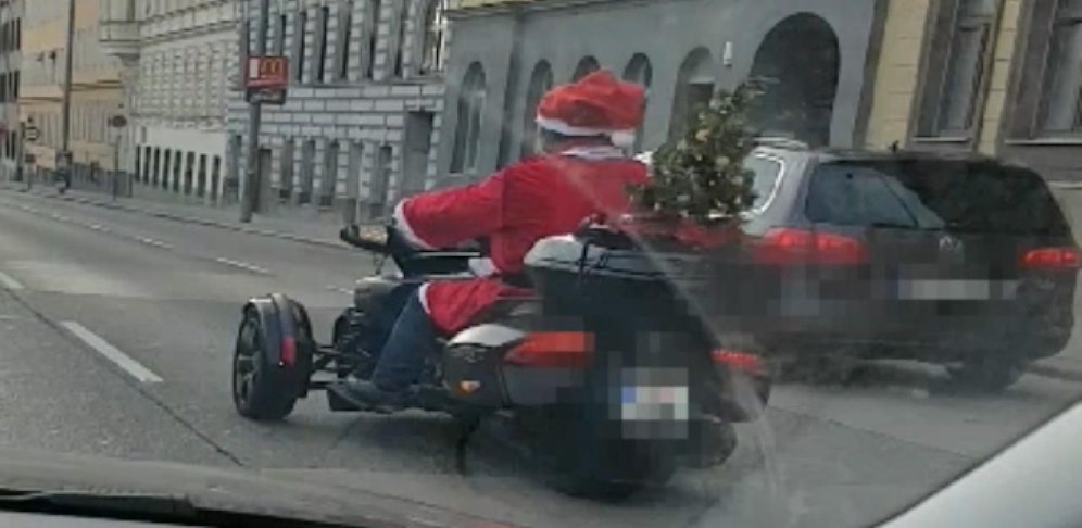 "Heute"-Leserin Marina N. erwischte ihn am Samstag kurz vor 15 Uhr in Wien. Besonders auffällig waren dabei nicht nur das rote Kostüm und der Mini-Christbaum am Heck, sondern auch das Gefährt an sich. Dabei handelt es sich nämlich um ein Dreirad, ein sogenanntes "Trike" – sieht man auch nicht alle Tage.