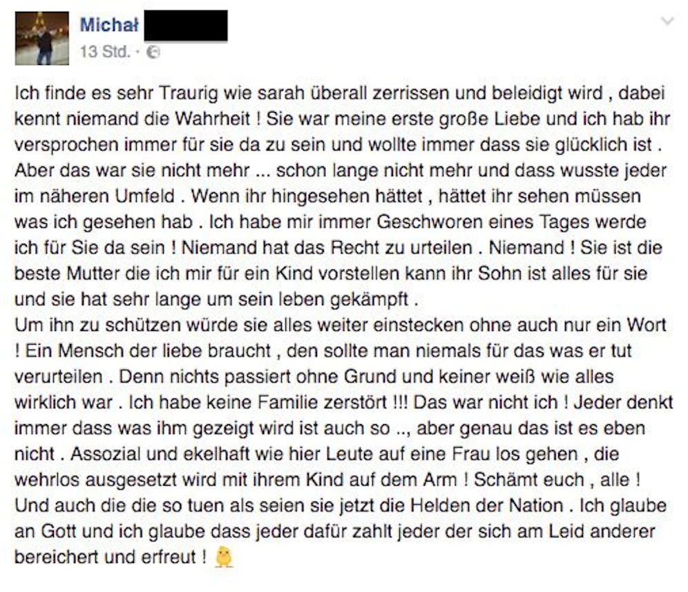 "Ich finde es sehr Traurig wie sarah überall zerrissen und beleidigt wird , dabei kennt niemand die Wahrheit! Sie war meine erste große Liebe und ich hab ihr versprochen immer für sie da zu sein und wollte immer dass sie glücklich ist . Aber das war sie nicht mehr ... schon lange nicht mehr und dass wusste jeder im näheren Umfeld . Wenn ihr hingesehen hättet , hättet ihr sehen müssen was ich gesehen hab", so Michal T. auf Facebook.
