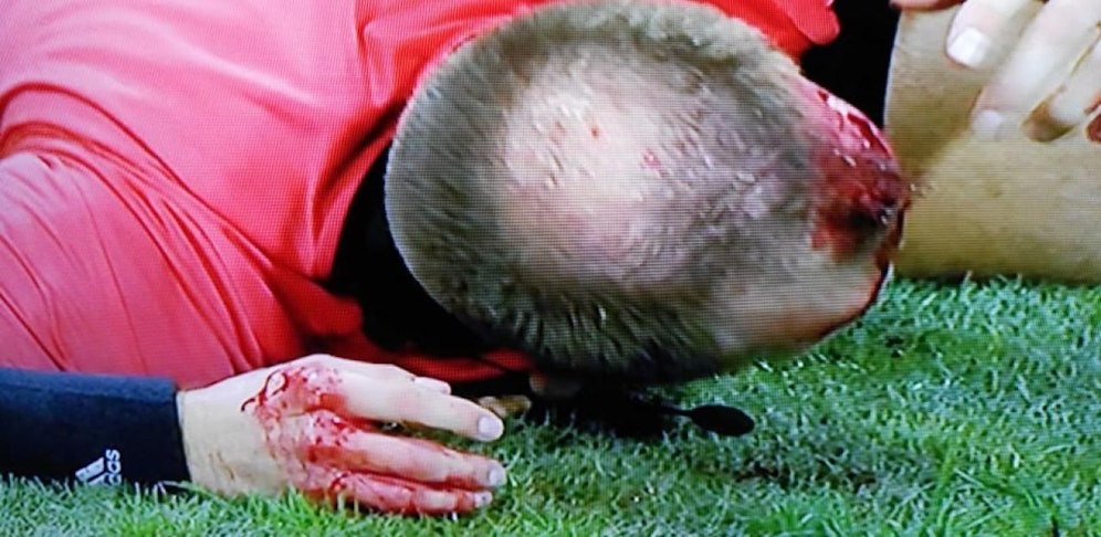 Mit einer klaffenden Wunde am Kopf brach der Assistent zusammen, der Schiedsrichter unterbrach das Match sofort. Sofort wurde er verarztet und mit einem Turban erstversorgt.