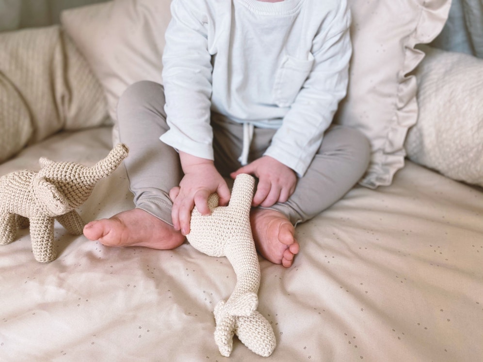 Natürlich dürfen die Kuscheltiere jetzt auch nicht mehr fehlen: Ich hab meinem Kind, neben seinem Lieblingstier, auch ein paar (selbst-)gehäkelte Figuren an das Fußende gelegt, mit denen es sich in der Früh immer gern beschäftigt und ich so noch einige Minuten länger schlafen kann. Das ist für uns beide also eine ganz klare Win-Win-Situation.