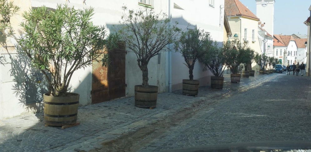 Mit dem Aufstellen von Parkbänken und Oleanderbüschen können nun Fahrzeuge nicht mehr entlang der Kirchengasse in Gumpoldskirchen abgestellt werden.