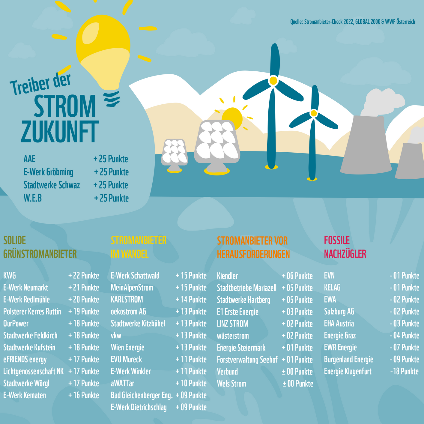 Der alljährliche "Stromanbieter-Check" der Umweltschutzorganisationen WWF Österreich und Global 2000 zeigt auch heuer wieder großen Aufholbedarf bei der Klima- und Naturverträglichkeit der heimischen Stromerzeugung. Nur vier Anbieter schafften es demnach in die oberste Kategorie der "Treiber der Stromzukunft".