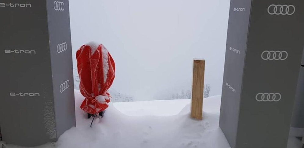 Schuld ist schlechtes Wetter. Wegen Schneefalls kann das Rennen nicht wie geplant zur Mittagszeit gestartet werden, schreibt der Verband und teilt ein Foto aus dem verschneiten Starthaus.