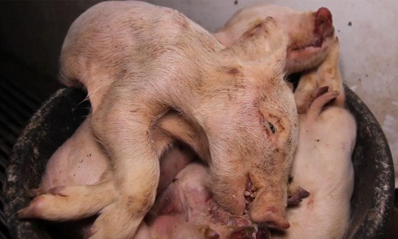 Die kleinen Ferkel zeigen blutende Kratz- und Bisswunden am ganzen Körper. Der Grund dafür ist einfach erklärt: In der Leistungszucht bringen die Schweinemütter viel zu viele Ferkel auf einmal auf die Welt und der Kampf um die geringere Anzahl der Zitzen ist unausweichlich. In den sogenannten "Abferkelbuchten", wo die Mütter untergebracht sind gibt es kein vor- und zurück für die Schweine. Sie müssen sich damit abfinden, dass auch ihre bereits verwesenden, toten Kinder neben ihnen liegen, die erst Tage später mit einem Kübel eingesammelt werden.