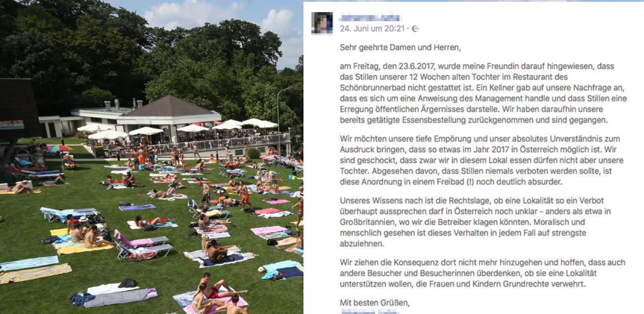 Ein wütendes Facebook-Posting sorgt derzeit für Aufregung in Wien. Ein erboster Badegast schilderte wie seine Freundin vom Personal aus dem Restaurant des Schönbrunner Bades in Wien-Hietzing hinauskomplimentiert wurde. Grund dafür war offenbar, dass sie ihr 12 Wochen altes Kind im Lokal stillte.