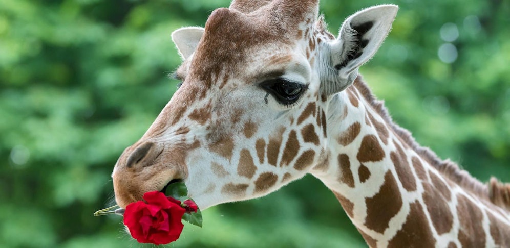 Als Fachmann weiß er genau, womit er den afrikanischen Langhälsen eine Freude machen kann, denn für diese sind die stacheligen Blumen ein wahrer Leckerbissen. Das Giraffen-Trio Fleur, Sofie und Obi ließ sich die bunte Mischung aus Hecken- und Kletterrosen prompt gut schmecken.