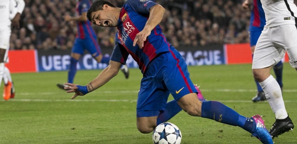 Gar nicht so lange her: Beim 6:1-Erfolg im Champions-League-Achtelfinale holte Barcelona-Stürmer Luis Suarez den zweiten Elfmeter gegen Paris St. Germain auf spektakuläre Art und Weise heraus. Legendär dabei: sein Griff an den Hals.