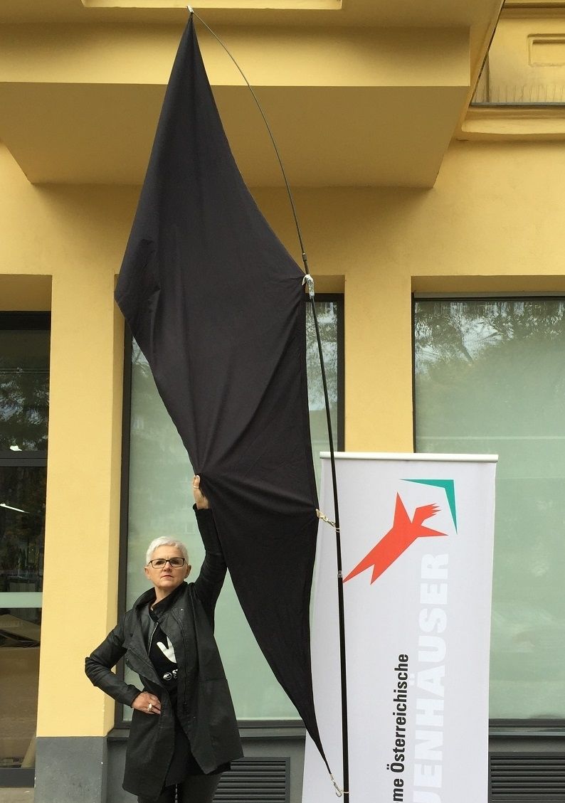 Der Verein Autonome Österreichische Frauenhäuser hisst die schwarze Fahne aufgrund des 18. Frauenmordes, der in Österreich dieses Jahr begangen wurde und fordert 18 Schweigeminuten.