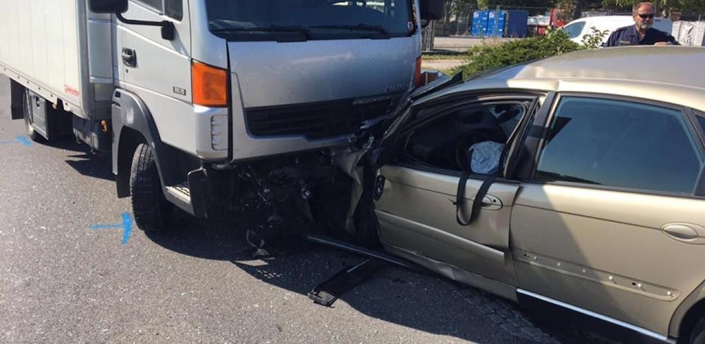 Ein Klein-Lkw und ein Pkw waren zusammengekracht, der Pkw unter dem Lkw verkeilt – das Fahrzeug musste mittels Seilwinde herausgezogen, bevor er geborgen werden konnte.