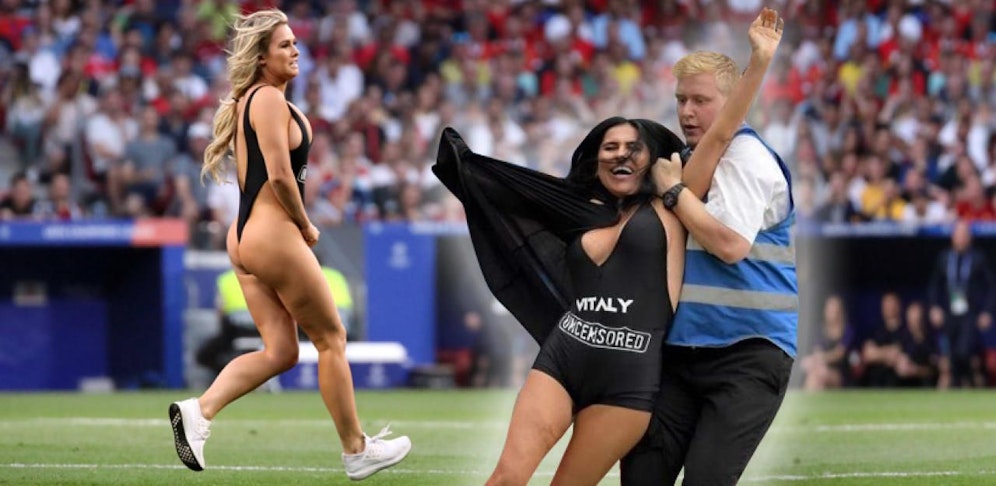 Eine halbnackte Frau in einem schwarzen Badeanzug stürmt das Endspiel eines Sport-Großereignisses, das weltweit Millionen Fans vor die TV-Geräte lockt – kommt Ihnen das bekannt vor?