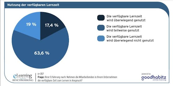 Digitales Lernen ist mittlerweile ein fester Bestandteil in der betrieblichen Weiterbildung und Qualifizierung im deutschsprachigen Raum. Doch häufig fehlt es an unterstützenden Rahmenbedingungen, wie beispielsweise ausreichend Zeit oder eine etablierte Lernkultur, um die digitalen Lernangebote wirklich wahrzunehmen. Vor diesem Hintergrund gibt eine Teilstudie vom eLearning Journal und GoodHabitz, die 2022 von März bis Juni 448 Unternehmen in der DACH Region befragte, einen Einblick in das Thema "Lernzeitkontingent" und untersucht, wie Unternehmen es ihren Beschäftigten ermöglichen oder erschweren, die vorhandenen E-Learning-Angebote tatsächlich zu nutzen. Erste wichtige Erkenntnisse sind: Bei rund zwei Dritteln (62,4%) der befragten Unternehmen gilt, dass Lernzeit = Arbeitszeit ist. Mit 63,8 Prozent steht der Mehrheit der Mitarbeitenden unter einer Stunde Lernzeit pro Woche zur Verfügung. Mit 88,8 Prozent ist ein zu hohes Arbeitspensum der Grund, wieso Mitarbeitende ihre Lernzeit nicht in Anspruch nehmen.