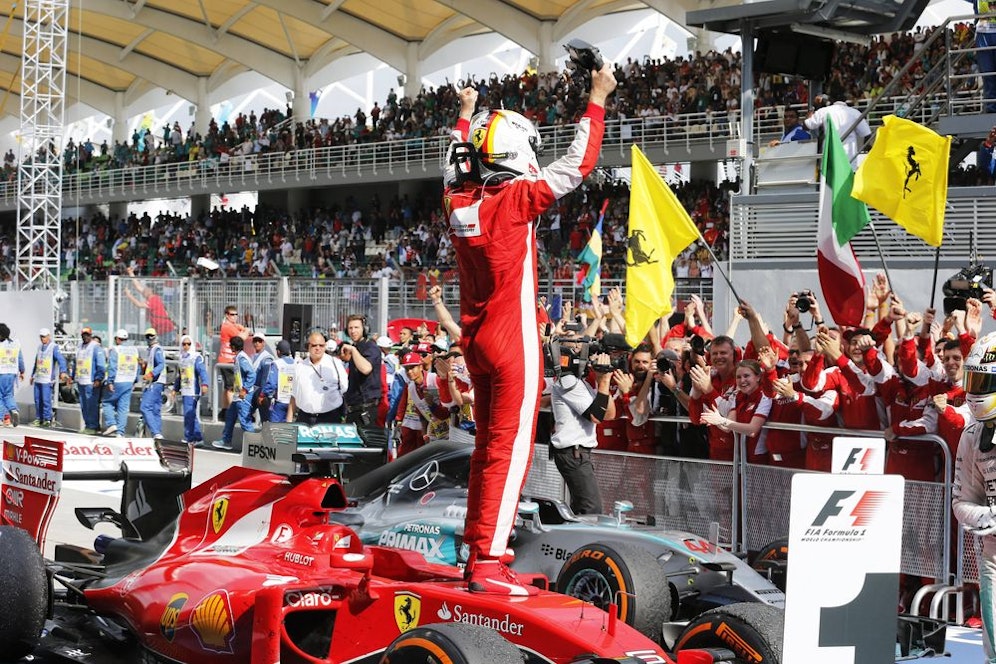 Mit dem Sieg beim Grand Prix von Malaysia sorgte Sebastian Vettel für eine faustdicke Überraschung. Er beendete aber auch eine elends lange sieglose Durststrecke von Ferrari. Nach der Zieldurchfahrt kochten dann die Emotionen über.