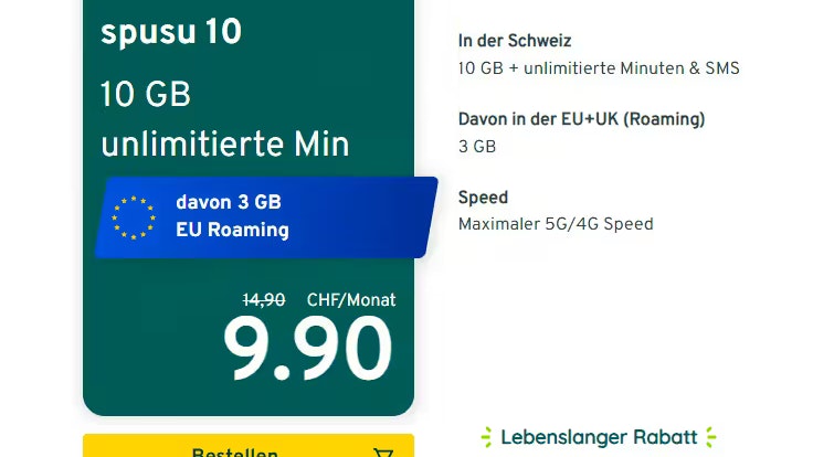 Die Angebote von Spusu sind günstig. Ein Abo bietet in Europa 50 GB Roaming, 1.000 Gesprächsminuten und 1.000 SMS (außerdem unlimitierte GB und Min. in der Schweiz, Anm.) pro Monat für 49.90 Franken. Ein vergleichbares Abo gibt es nur selten günstiger.