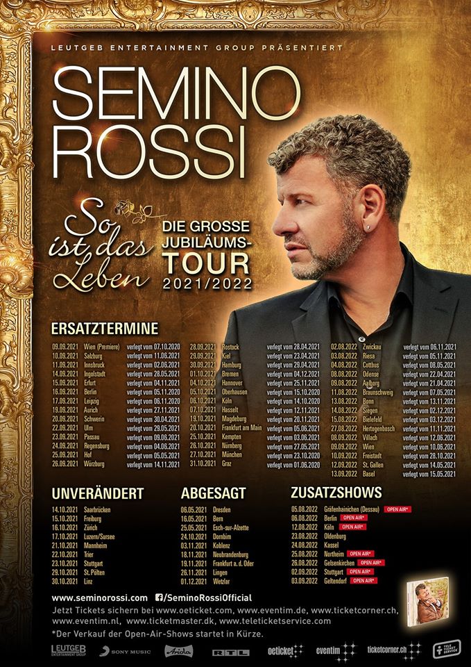 Die Künstler und Veranstalter sehen sich derzeit besonders gezwungen, trotz avisierter Lockerungen über den 31. August 2020 hinaus, ihre geplanten Tourneen zu verschieben. Derzeit könne man nicht abschätzen, wie sich die Situation entwickelt, heißt es seitens des Veranstalters, der Leutgeb Entertainment Group. Aus diesem Grund hätte man bedauerlicherweise die Große Jubiläumstour von Semino Rossi verschieben und reorganisieren müssen.