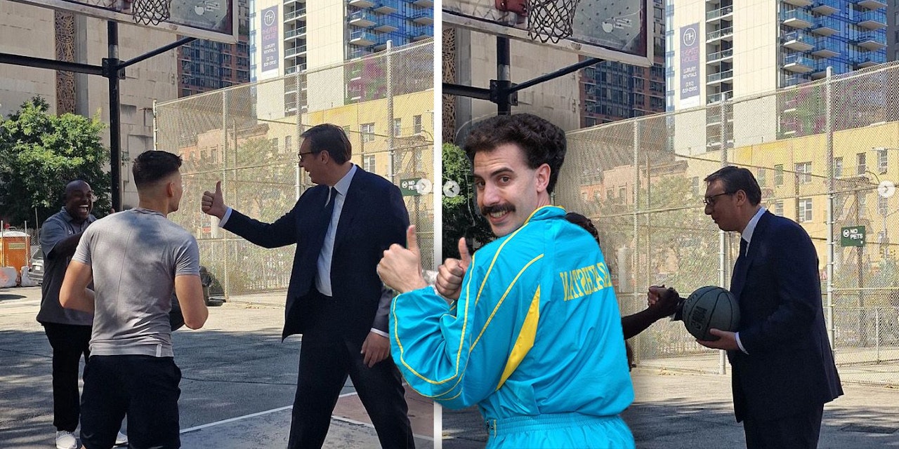 Ein langer Mann im Anzug mit komischen Bewegungen auf Erkundungsreise durch die "US und A": Was wie eine Beschreibung der us-amerikanischen Mockumentary "Borat – Kulturelle Lernung von Amerika, um Benefiz für glorreiche Nation von Kasachstan zu machen" klingt, könnte zweifelsohne auch für die Basketball-Einlage von Vučić in New York City gelten.