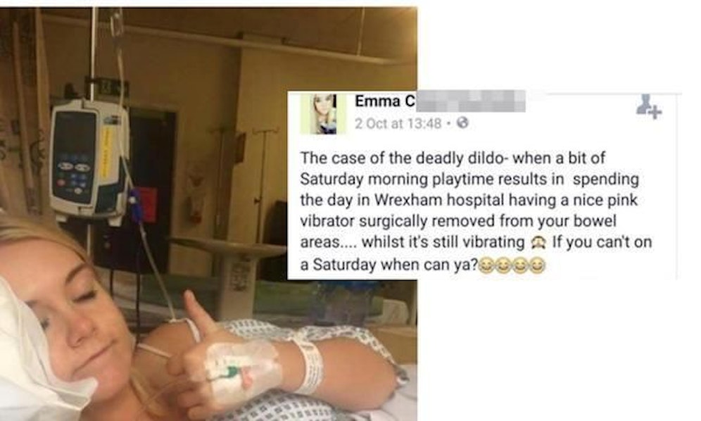 Viele Facebook-Nutzer lassen ihre Freunde über das Soziale Netzwerk tief blicken - so weit wie die 24-jährige Emma R. aus Großbritannien gehen aber die wenigsten. Am Sonntag postete sie ein Foto von sich aus dem Spital. Im Bildtext gestand sie: Ihr pinker Vibrator war im Hintern geblieben - "während er noch vibrierte".