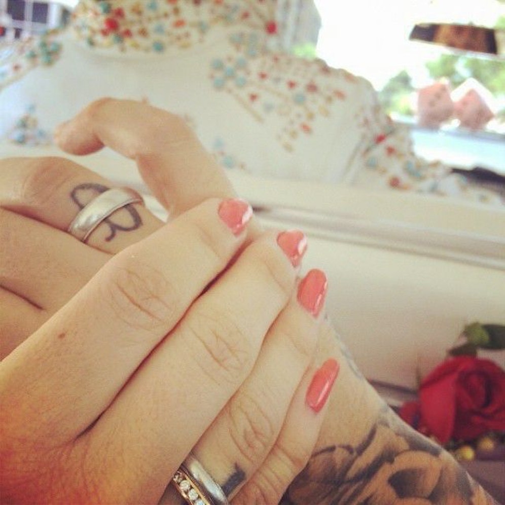 Dort postete die TV-Beauty ein Bild zweier Hände - Ehering inklusive. "Oops we did it again !!! #refreshlyweds", was soviel heißt wie "Ups, wir haben es schon wieder getan !!! #wiederfrischverheiratet", schrieb sie dazu. Im Hintergrund ist das Kostüm eines Elvis-Imitators zu erkennen. Es liegt also nahe, dass die Trauung in Las Vegas stattfand.