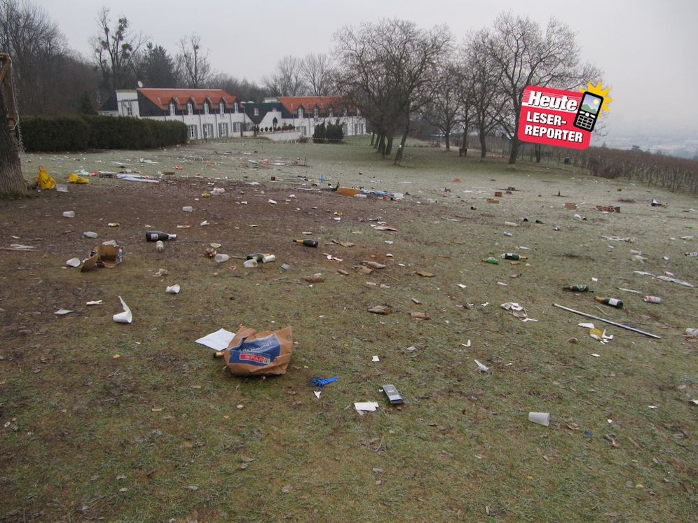 Leserreporter Adolf Riess schickte ein paar Bilder von der Wiese, von der aus man in der klaren Silvesternacht sicherlich einen wunderbaren Ausblick über Wien hatte. Die Partymeute vergaß allerdings darauf, den Müll, den das rauschende Fest verursachte, fachgerecht zu entsorgen. Sektflaschen, Einkaufssackerl und Raketenreste säumen den grünen Rasen. Und so präsentiert sich der Wilhelminenberg nun als Schlachtfeld.