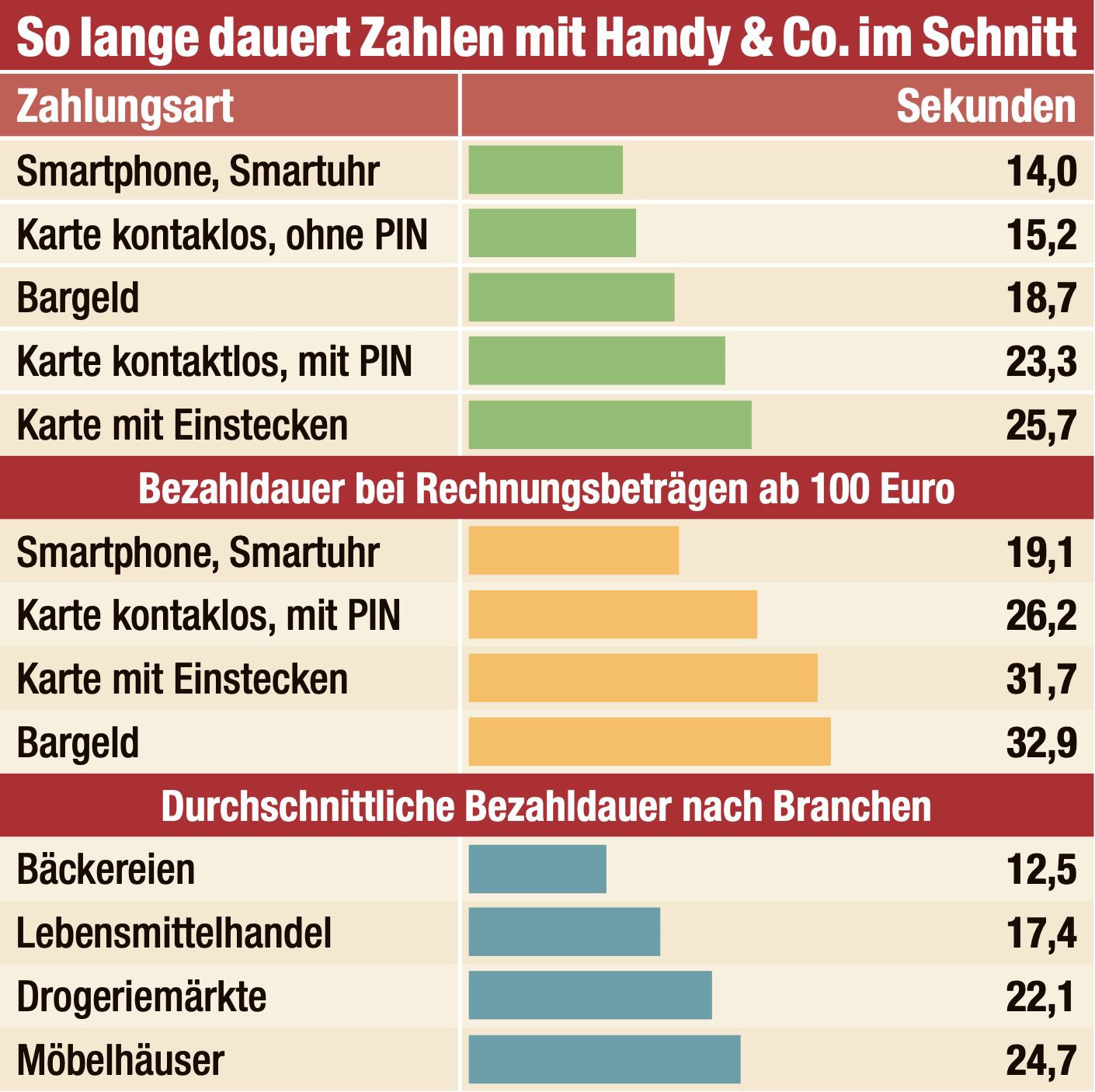 Klarer Fall: Am schnellsten bezahlt man laut Analyse mit dem Handy oder mit der Smartuhr. Im Schnitt vergehen hier zwischen Nennung des Betrags und Übergabe der Rechnung gerade einmal 14 Sekunden. Wer noch nicht ganz so digital unterwegs ist, fährt mit kontaktloser Kartenzahlung ohne PIN-Eingabe (das ist bei uns bei Beträgen bis 50 Euro möglich) ebenfalls noch extrem gut. Nur 15,2 Sekunden dauert's hier, bis man das Geschäft verlassen kann.