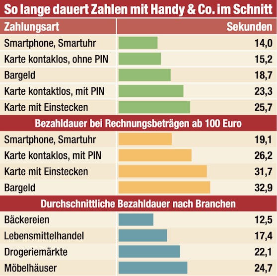 Schon etwas länger, nämlich durchschnittlich 18,7 Sekunden vergehen, wenn man des Börsel mit Bargeld zückt. Dahinter folgen Karte kontaklos mit PIN-Eingabe (23,3 Sekunden) und Karte mit Einstecken in den Terminal (25,7 Sekunden).