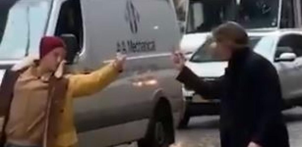 Am Dienstagabend begeistert ein Video mit einem bizarren Showdown das Internet. Zu sehen waren zwei jungen Männer die sich in Soho, New York, streiten. Anstatt Fausthiebe zu verteilen, zeigten sich die Männer mit zunehmender Wut nur den Mittelfinger. Das Lustige daran: Sie bleiben nie stehen und hören nicht auf, selbst als der eine die Straße überquert und fast von einem Lieferwagen angefahren wird.