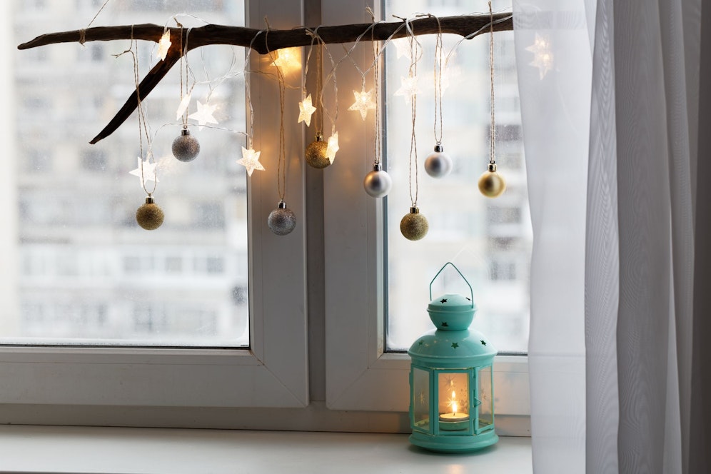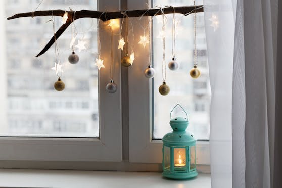 Zunächst die Lichterkette ganz locker um den Ast hängen - hier bietet sich eine batteriebetriebene besonders an, da man kein Kabel bis zur nächsten Steckdose legen muss. Danach einfach, wie beim Weihnachtszweig, mit diversem Christbaumschmuck dekorieren und mit zwei Kordeln von links nach rechts ins Fenster hängen. Fertig.