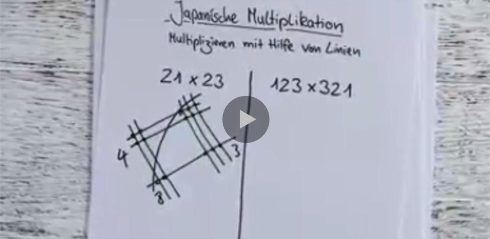 So lernen japanische Kinder die Multiplikation mit Hilfe von simplen Linien. Die einzelnen Ziffern der Faktoren werden als sich überkreuzende Linien aufgemalt.