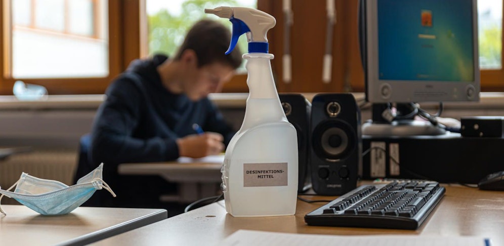 Der Mund-Nasen-Schutz bleibt weiter auf, solange bis die Schüler im Klassenzimmer auf ihrem Platz sitzen. Pro Tisch sitzt ein Schüler, mit Mindestabstand zueinander. In jedem Klassenzimmer steht ein Desinfektionsmittel auf dem Lehrertisch, das die Schüler benützen können.