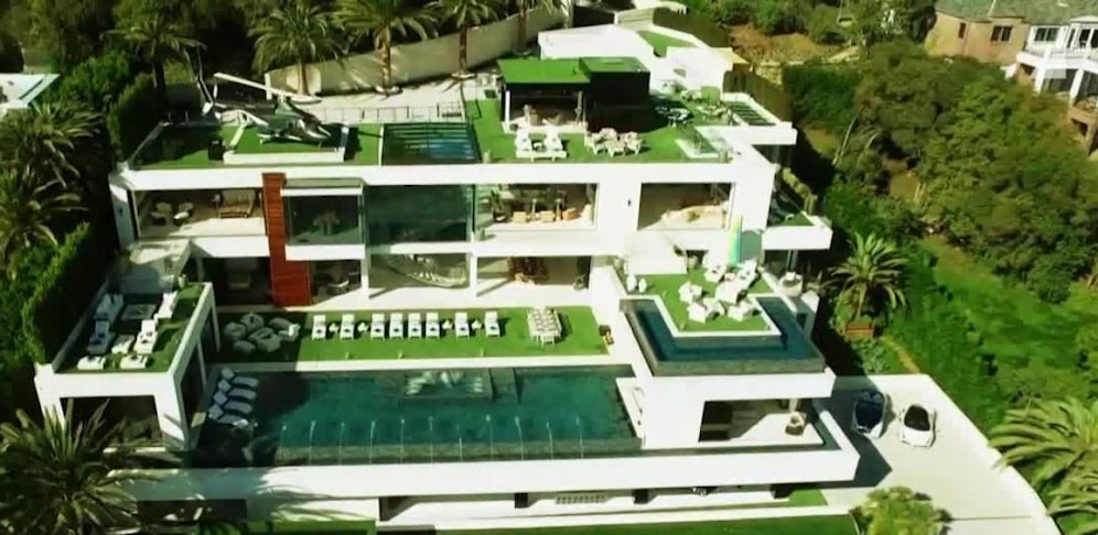 Das Haus in Zahlen: Zwölf Bars, zwei Schampuskeller, zwölf Schlafzimmer, 21 Badezimmer, drei Küchen, ein Spa, fünf Panoramaterrassen, eine Bowlingbahn, zwölf Autos im Wert von 20 Millionen, riesige Fernseher, vier Pools und über 100 Kunstwerke. Eine einzige Besichtigung der vier Stockwerke dauert eineinhalb Stunden.
