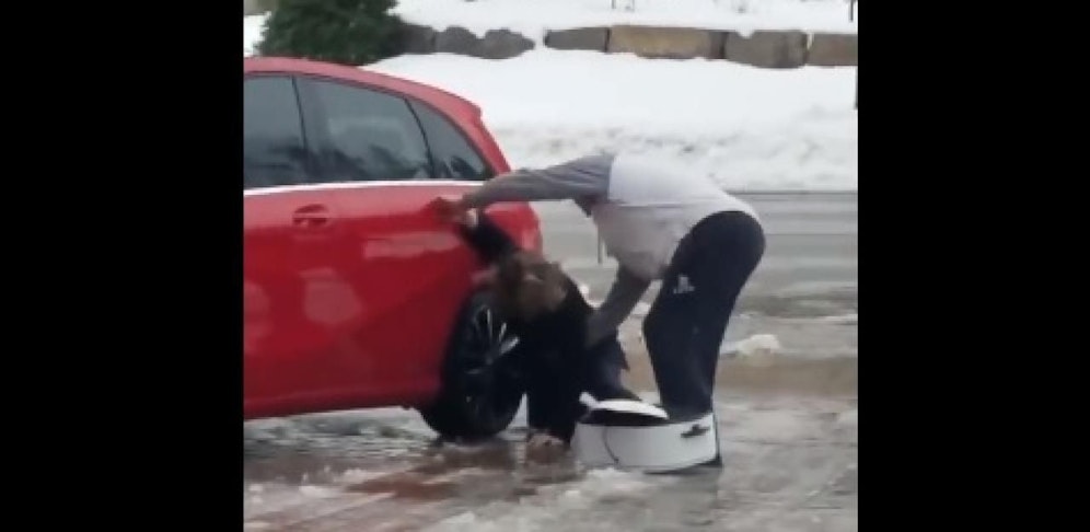 Über die Nacht haben die eisigen Temperaturen die Auffahrt zur Eislaufbahn gefrieren lassen. Eine Frau versucht trotzdem in ihren Mercedes zu steigen.