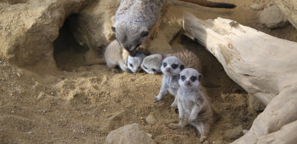 Jetzt ist es endlich soweit! Die vierköpfige Rasselbande beim Erdmännchen-Nachwuchs im Linzer Zoo traute sich erstmals aus den Höhlen. Immer mit dabei ist Mama "Nadine".