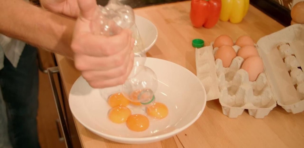 So ist eine Plastikflasche unter anderem auch ein nützliches Gerät in der Küche. Mit ihr lassen sich zum Beispiel ganz einfach Eier trennen.