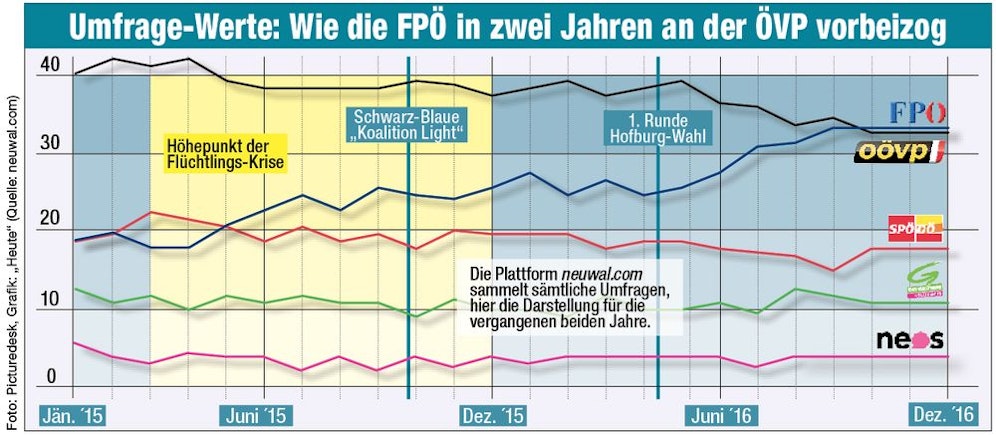 Im Herbst 2016 schließlich zeigen ersten Umfragedaten die FPÖ vor der ÖVP, daran hat sich seither auch nichts mehr geändert.