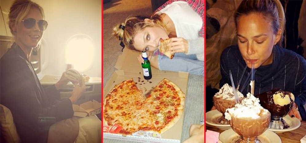 Man möchte meinen, Fast Food, Naschsachen und sonstige kalorienreiche Leckereien vertragen sich von Natur aus nicht mit dem Lebensstil der Schönen, Schlanken und Reichen. Ein Blick auf die Instagram-Profile von Heidi Klum, Cara Delevingne und Co. lässt jedoch an dieser einfachen Formel zweifeln. Dort posten die Stars und Sternchen nämlich Schnappschüsse ihrer Fressorgien - und das am laufenden Band. Die Promis brüsten sich mit beladenen Tellern und wollen so vermitteln: "Ich esse was ich will und verzichte auf nichts!". Wir stellen die Königinnen des fettigen Foto-Genusses vor.