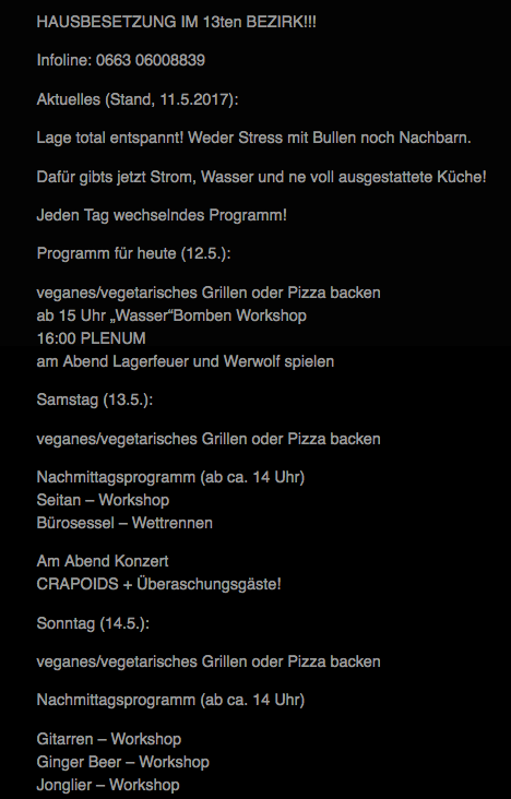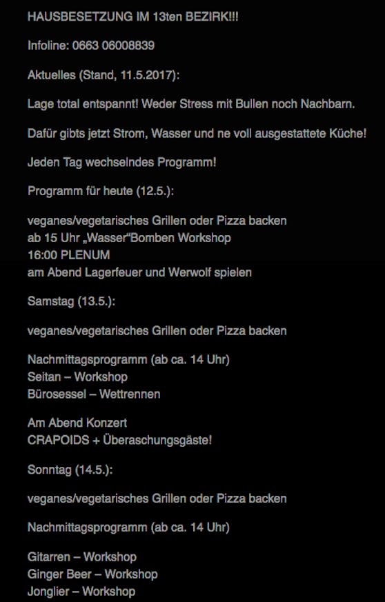 Wasserbomben-Workshop, am Lagerfeuer Werwolf spielen und Bürosessel-Wettrennen: Den Hausbesetzern, die am Samstag die ehemalige Krankenschwesternschule in der Jagdschlossgasse 21-25 in Wien-Hietzing in Beschlag genommen hatte, wurde nicht fad. Das zeigt das Programm (siehe Foto unten), das die „Evolutionäre Randgruppe" auf ihrer Homepage postete.