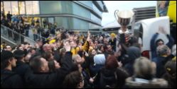 Um 6:00 Uhr in der Früh bog der gelb-schwarze Caps-Bus bei der Albert-Schultz-Halle ein. Rund 300 jubelnde Fans nahmen die erfolgreichen Cracks der Vienna Capitals in Empfang. Sie hatten stundenlang auf die Ankunft gewartet.