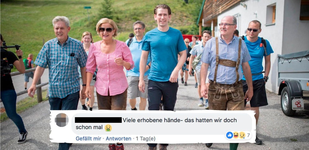 Nach dem Wanderausflug auf den Schneeberg (NÖ) von Sebastian Kurz und Johanna Mikl-Leitner ("Heute" berichtete) postete der Kanzler Fotos von der Wanderung auf seinem Facebook-Account. Die Vorsitzende der Kinderfreunde und Roten Falken Vösendorf (eine SP-Organisation) kommentierte die vielen Anhänger und erhobenen Hände so: "Viele erhobene Hände - das hatten wir doch schon mal (Anm.: dazu ein kotzendes Emoji)".