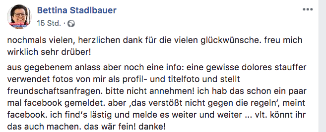 Auf Facebook warnte sie: "Eine gewisse Dolores Stauffer verwendet Fotos von mir als Profil- und Titelfoto und stellt Freundschaftsanfragen. Bitte nicht annehmen."